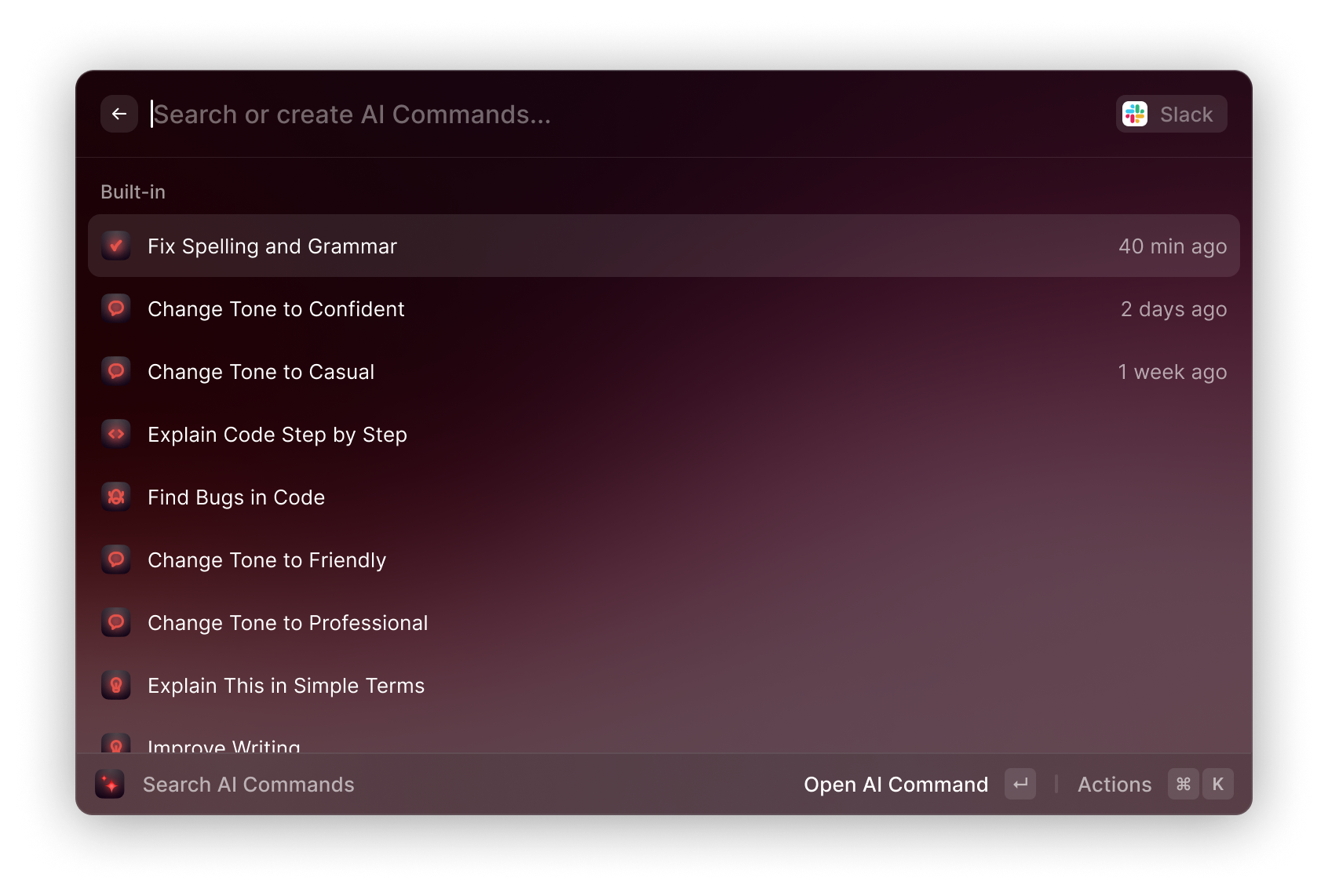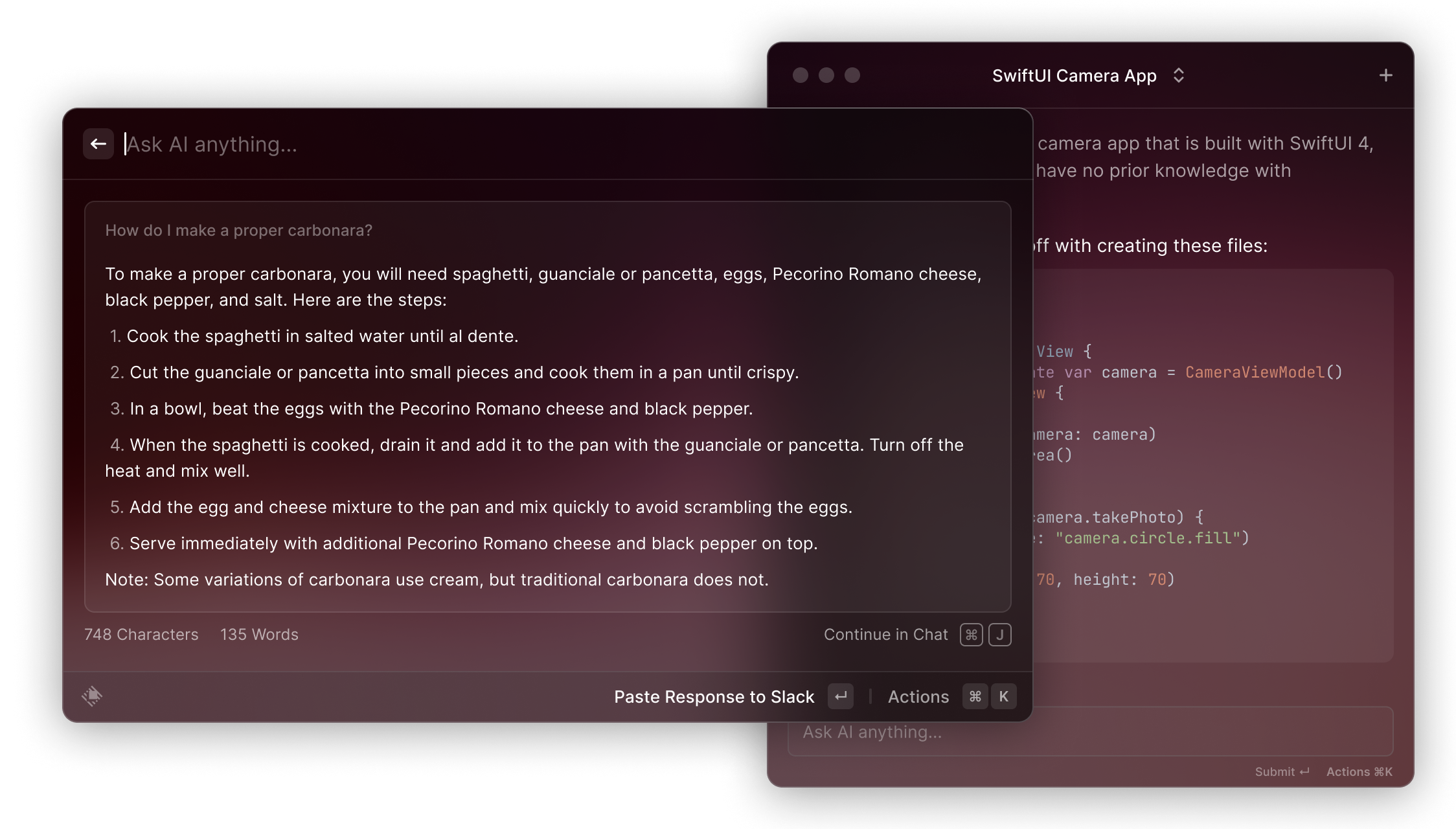 Write smarter, code faster and answer questions quicker with ChatGPT in Raycast. Deeply integrated into macOS and just one keystroke away.